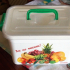 Внешне он очень симпатичный, представляет собой белую коробочку из пищевого пластика, на внешней стороне которого красуется надпись: «Все на пикник» с красивым и ярким рисунком с аппетитными фруктами. Контейнер не маленький, но объемный, объем его составляет 6.5 литров. Контейнер имеет съемную пластмассовую крышку с ручкой. Ручка у нас зеленого цвета. При не использовании она утапливается в корпус контейнера, делая поверхность абсолютно ровной. Крышка контейнера очень плотно прилегает к корпусу контейнера при помощи двух защелок, что делает его герметичным.