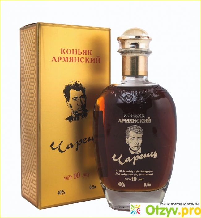 Я покупал Чаренц 10-летней выдержки по цене 1100 рублей, также есть этот напиток с 20- и 30-летней выдержкой, их я, к сожалению, не пробовал и ничего сказать не могу. Кстати, коньяк назван в честь армянского поэта Егеша Черенца, а его портретом украшена лицевая сторона бутылки.