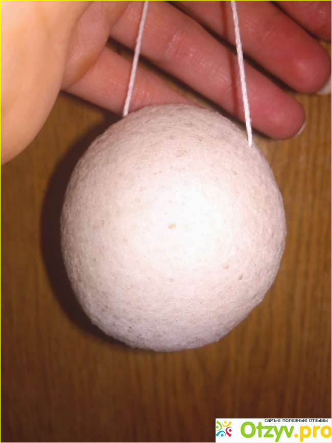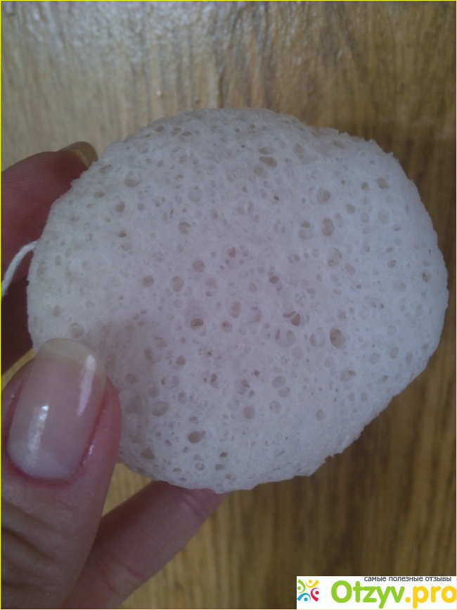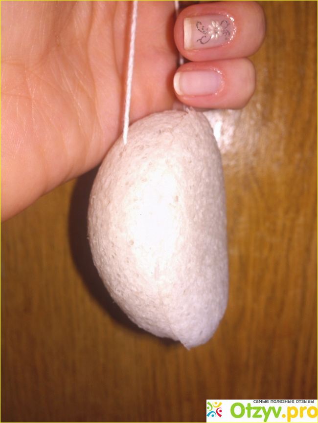 Оказывается, он сделан из какого-то азиатского растения, которое так и называется - конжак или конняку. Об этом я прочитала в интернете. Волокна спонжа натуральные. Очень удобно, что через спонжик продета верёвочка. Я вешаю спонж за эту верёвочку в ванной до следующего умывания.