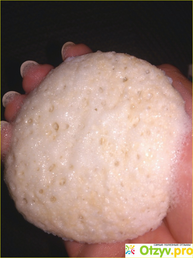 Сам конжак был твёрдым, как камень, когда я его вытащила из пакетика. Я даже сразу расстроилась, так как не представляла, как им можно очистить нежную кожу лица. Спонж был похож на пемзу для ног. Внимательно прочитав инструкцию, поняла, что его нужно хорошенько намочить водой, тогда конжак станет мягким. И действительно, пока даржала конжак под струёй воды, невооружённым глазом было видно, как он моментально становится мягоньким. Для умывания лица я пользуюсь обычным дегтярным мылом, так как считаю данный продукт полезным и натуральным, поэтому, на спонжик нанесла немного дегтярного мыла.