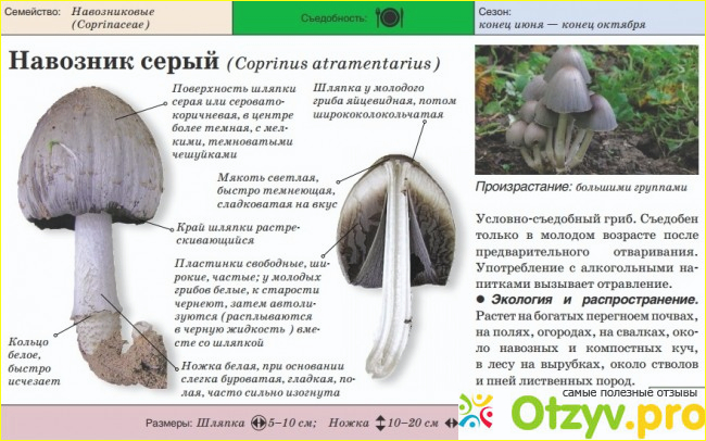 Зрительно этот гриб очень напоминает поганку и стал известен широким массам людей благодаря своей интересной специфике-при его совместном употреблении с алкоголем, он препятствует распаду алкоголя в организме и токсичность от распада алкоголя, которая происходит после его употребления, начинает накапливаться в организме и как результат, человек употребивший алкоголь с этим грибом страдает от сильной интоксикации. Такой эффект достигается благодаря тому что в составе гриба есть коприн, именно этот его составной компонент и является несовместимым с алкоголем. Такое состояние у него длится в течении двух-трех дней. Об этой его особенности знали еще со времен Древней Руси, алкоголь тогда тоже употребляли и поэтому порошок из этого гриба добавляли тайно пьющему, как результат уже через один-три месяца такого систематического тайного подсыпания человек испытывал отвращение к алкоголю и переставал его употреблять. Спустя столетия, ситуация особо не изменилась, есть пьющие и есть те, кому эти пьющие своей пагубной привычкой разрушают жизнь, поэтому иногда порошок копринуса подсыпают пьющему тайно. Летальных исходов от употребления этого продукта не было, но есть вероятность того, что человек его принимающий может попасть в больницу на непродолжительный срок, где ему диагностируют не отравление грибами, а отравление продуктами этанола. В случае употребления с алкоголем необходимо знать, что от такого совместного употребления возможно проявление следующих побочных эффектов: