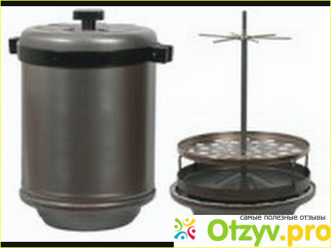 По внешнему виду напоминает ведро из нержавеющей стали с крышкой.