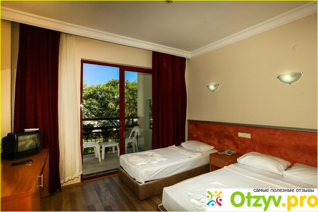 Номер маленький: две кровати (одна двухспальная, вторая односпальная), телевизор допотопный с одной программой русской, которая вещает фильм, а потом переходит на их местное шоу, холодильник старье, сейф платный (два евро в сутки), шкаф, вешалки, сан узел более, менее.