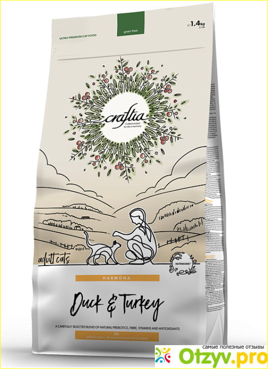 Мы решили попробовать Craftia Harmona Утка и Индейка для двух наших кошек. Одна, обычная беспородная, ест все подряд, а вторая - перс, очень чувствительная и капризная. Для перса искали именно беззерновой состав с нестандартным белком.