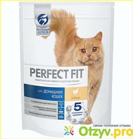 Расскажу свое мнение о сухом корме линейки Perfect Fit. Этот корм продается с разными вкусами. Я чаще всего беру со вкусом курицы. На упаковке написано «для домашних кошек».