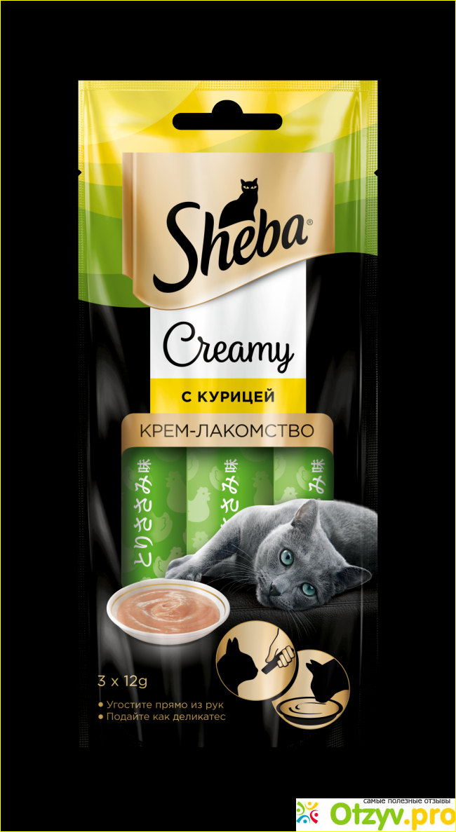Итак, Sheba Creamy это не корм, это лакомство, и в одной упаковке мы можем обнаружить три палочки с кремом, как например растворимый кофе на один раз. Каждый пакетик имеет вес 12 гр, и стоит все это удовольствие 83 рубля. Довольно дорого при такой граммовке. Но, как всегда люди готовы платить за новинки.