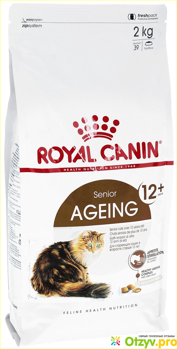 Затем аппетит стал хуже, появились капризы и мы перешли на сухой роял канин. А сейчас испытываем линейку 12+. Этот корм я брала на пробу в пакете по 400 гр, он полнорационный и содержит все необходимое для здорового и полноценного существования кошки. Цена за данную фасовку от 260 до 320 рублей. Сейчас я заказываю его в интернете, получается довольно выгодно. Корм создан с учетом особенностей стареющих животных. Например, стимулирует аппетит, делает профилактику заболеваний почек и мочеполовой системы. Также содержит в своем составе Омега 3, который позволяет справляться с возрастными изменениями и их проявлениями.