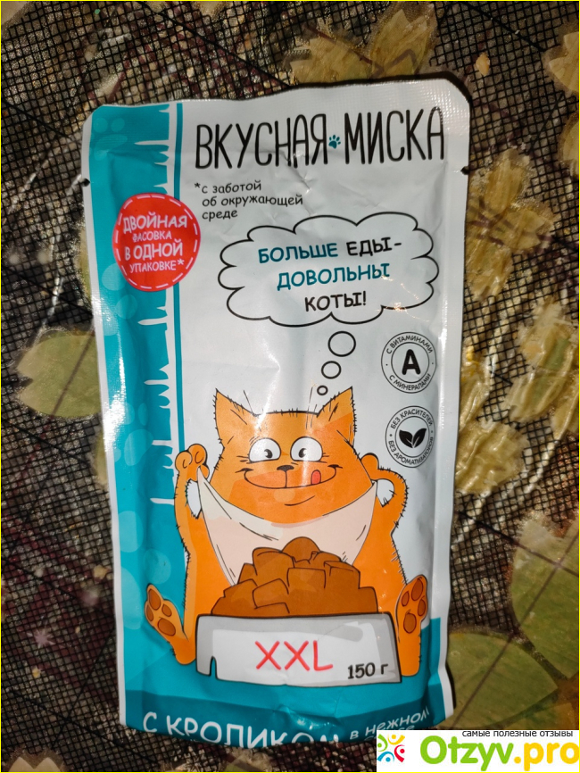 На прошлой неделе я купила корм этой серии с кроликом. И на удивление этот вариант он стал кушать. Беру теперь его. Цена за пакет 150 грамм от 27 до 36 рублей, смотря где брать. По качеству хуже только "Еда котов", то вообще дно.