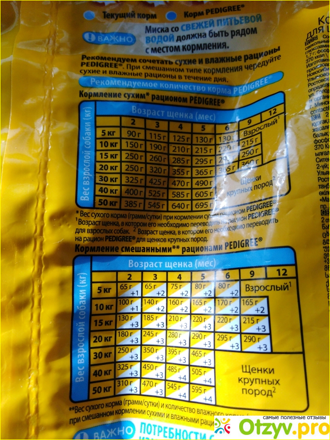 На обороте упаковки находится специальная таблица как кормить и сколько давать пищи в зависимости от возраста и веса щенка. Но, к своему удивлению я обнаружила что этот корм можно давать и уже взрослым собакам. И это тоже указано в таблице. Для моего щенка по таблице нужно было давать 295 гр. В первый раз я попыталась отмерить на весах. Но мои электронные весы показывали вес не очень точно. Поэтому я стала класть корм как считала нужным. Со временем я поняла сколько приблизительно корма нужно моему псу на один раз. Важно при кормлении щенка любым сухим кормом необходимо меть в миске достаточное количество воды для питья. Сухой корм вызывает сильную жажду у животного и дополнительная вода просто ему необходима.