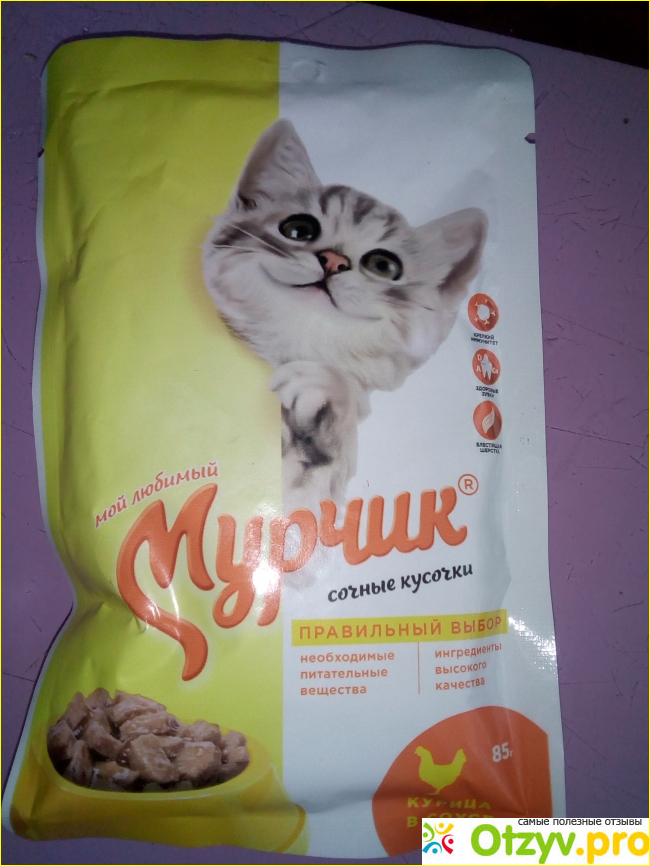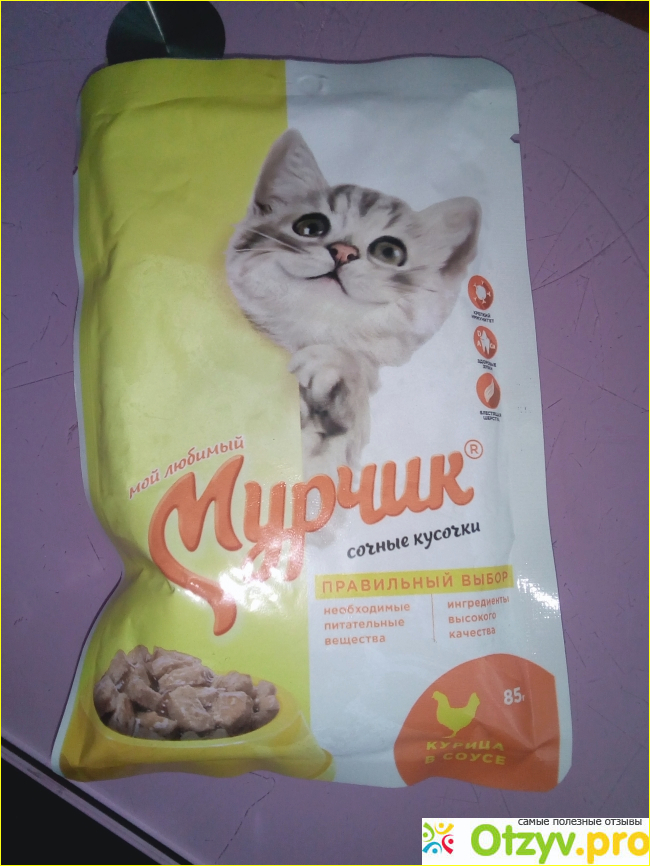 А вот из сырых предпочитает корм с курицей в соусе от фирмы "Мой любимый Мурчик". И я с ним согласен. Сейчас расскажу почему. Продается этот корм только в определенных супермаркетах у дома. Стоит 10 рублей. Недорогой корм для домашнего любимца. Пачка большая - 85 грамм. На пачке изображение котенка и рядом миска с кусочками корма. Сзади пачки информация о составе и производителе. Состав: мясо и субпродукты, злаки, минеральные вещества. Содержит таурин. Открыл пачку, наложил полную миску коту. Куски средние, рыхлые. Соус густой. Запах ближе к курице. Кот ест хорошо, никогда не отказывается от добавки. Советую всем. Вашим домашним животным понравится. Да и цена лучшая!