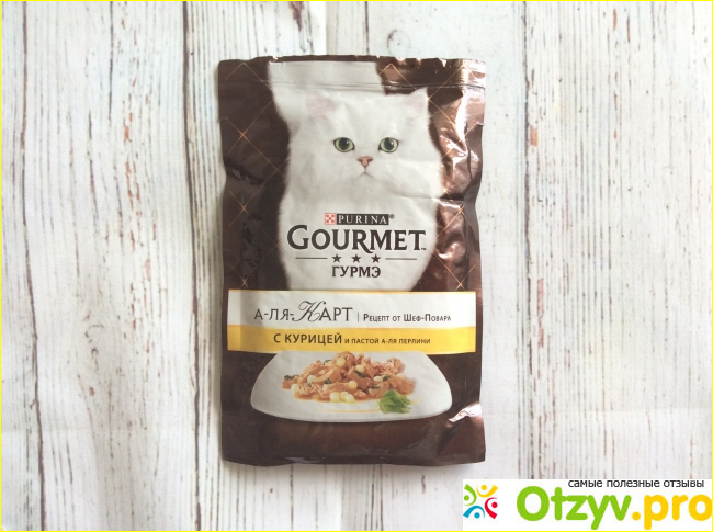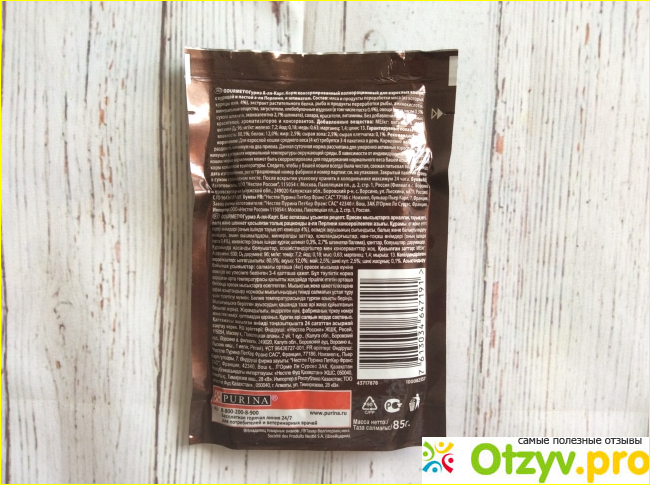 Упаковка представляет собой герметичное саше, максимально качественно сохраняющее продукт с момента производства и до кормления животного. Данный пакетик выполнен в коричневых оттенках, по которым можно ориентироваться в линейках этого влажного корма. На упаковке производитель оставил ряд информации. Я всегда обращаю внимание на состав. В данном случае он меня совершенно не впечатляет, так как в нём есть много подводных камней и скрытых ингредиентов. В первую очередь хочу обратить внимание на то, что в составе мяса всего 4 %. Это ничтожно малое количество на пакетик, особенно если учитывать факт, что питомец кушает вообще в принципе не очень много в течение дня. Помимо этого хочу уточнить, что в данном составе указана курица и её другие компоненты. При этом это могут быть перемолотые в пыль кости, а также другие не пригодные в пищу остатки от тушек куриц. В составе есть рыба, но при этом производитель не уточняет в каком количестве она содержится и не уточняет, к какому сорту она относится. В составе также присутствуют растительные компоненты, которые должны помогать перевариваться пище, есть компоненты, которые выступают в качестве загустителя, также есть сахар, консерванты, красители. И если консервант позволяет продукту дольше не портится, то от сахара можно было бы вообще отказаться.