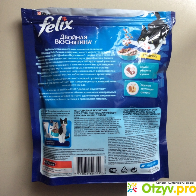 На упаковке есть масса информации, которая может пригодиться потребителю: вес; контактные данные производителя; советы производителя, как правильно комбинировать сухой и влажный корм ежедневно в рационе питомца; рекомендации по суточному кормлению; описание гранул, а именно нежные, мягкие кусочки, а также хрустящие гранулы; состав, в котором присутствуют злаки на первом месте, а также есть дрожжи и красители, неизвестного происхождения, антиоксиданты и консерванты, что не делает корм лично моих глазах приоритетным среди остальных; информация о корме, а именно ожидаемом положительном эффекте на здоровье питомца.