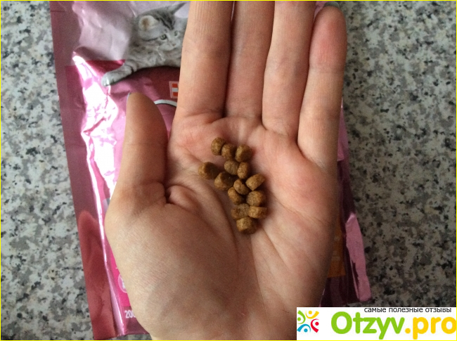 Корм, так как он необходим для кормления котят, имеет соответствующие размеры. Он достаточно маленький, имеет круглую форму. Такой корм очень легко поглощать маленьким котятам, не нанося вред неокрепшим зубам. Корм немного пористый, что дает сильный хруст при его поедании. Он однородного цвета, в упаковке не крошек, что наводит на мысль о том, что он совершенно не крошится.