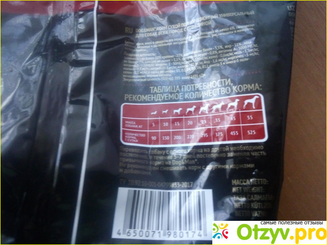 Представлена так же таблица потребностей в корме. У меня пёс достаточно крупный и рекомендуймая норма 375 грамм. я бы сказал это достаточно не мало. Одного пакета явно на день не хватит.