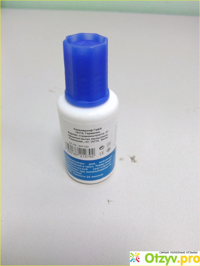 Канцелярская тема не дает мне покоя , поэтому хочу рассказать вам о моем любимом корректоре correction fluid фирмы Сильверхоф ГмБХ. Корректирующая жидкость предназначена для внесения исправлений в текст. Данный продукт имеет гигиенический сертификат , что не мало важно для нас , вдруг у кого-то ребенок лизнет или на лицо нанесет! Он абсолютно безопасен при использовании по назначению! Официальный срок годности 24 месяца, но моему больше 4-х лет и корректирует он отлично!