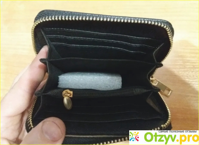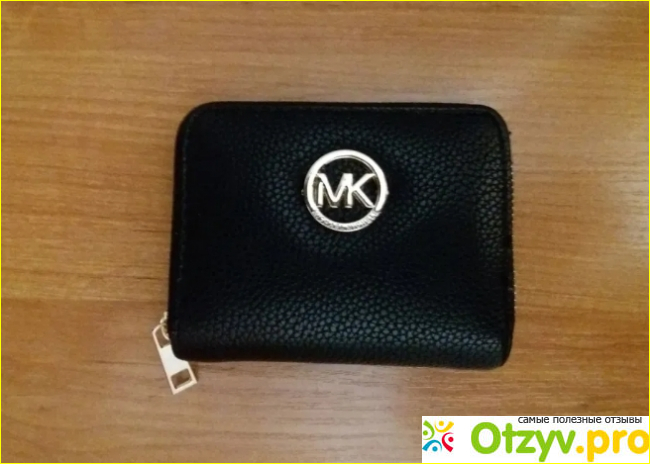 На передней тыльной стороне фирменный знак МК в кружочке. Задняя тыльная сторона чистая. По центру качественная змейка. Открывается легко. Имеется отсек для мелочи и два по бокам для денег или пластиковых карт. Пластиковые карты можно вставлять в три отсека для пластиковых карт. Размер его маленький, поэтому купюры приходится складывать пополам. Удобно носить в кармане или сумочке из-за его размеров. Запахов материал изготовления не имеет. Очень хорош к применению и использованию. Рекомендую.