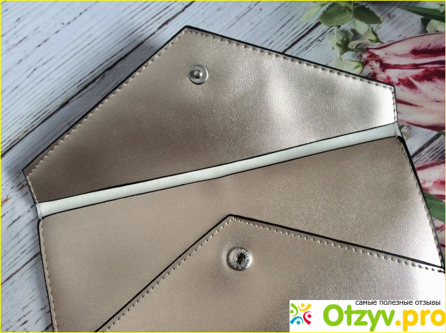 Косметичка представляет собой конверт, закрывающийся на кнопку.
