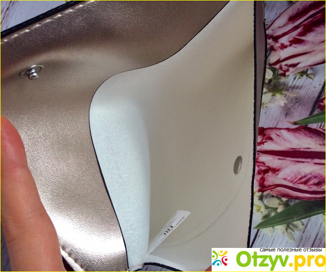 Закрывается косметичка на кнопку, достаточно крепко и надёжно. Что нельзя сказать о самой кнопке, ведь материал достаточно нежный, и эта кнопка обязательно со временем просто вырвется из материала.