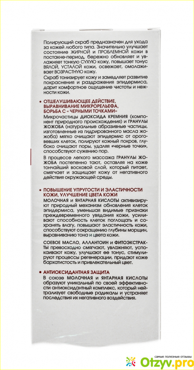 Поэтому многие профессиональные средства для очищения кожи от старых и не нужных чешуек используют различные кислоты. Как раз на этом принципе и основам полирующий скраб Кора. В его составе находится молочная и янтарная кислота. За счет этих веществ происходит небольшой химический пилинг.