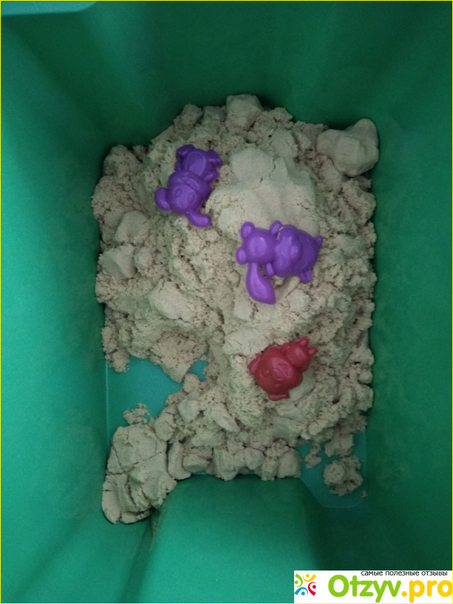 есть и минус она везде его разбрасывает, но он очень легко собирается. Дочку переполнял восторг до самого сна. Играла около 4 часов подряд, и даже спать хотела лечь с этим чудным песком.