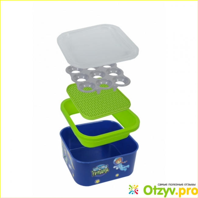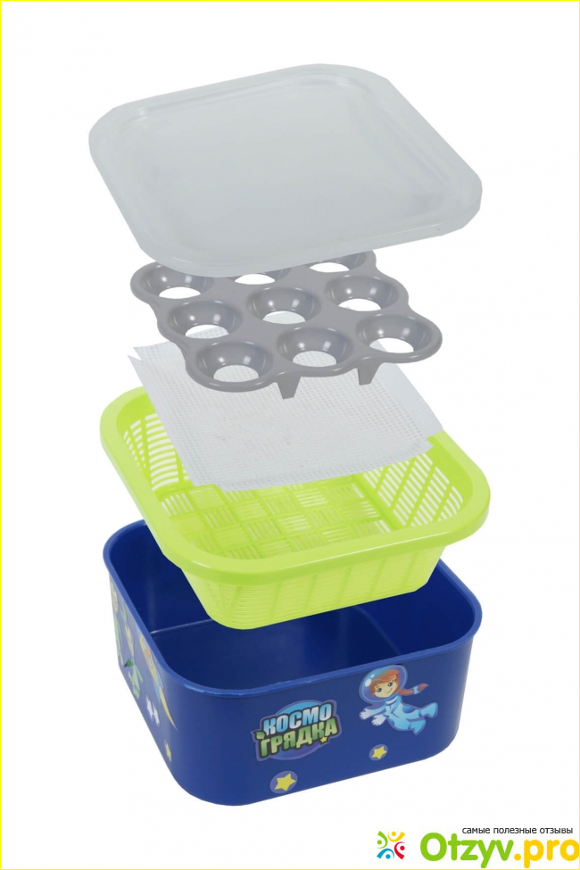 Все элементы наборы выполнены из пластика разного цвета. В наборе самое большое отделение предназначено для воды. Дальше в наборе есть специальная корзина для семян. Помимо этого там прилагается сразу подложка для выращивания микрозелени. Производитель даже предусмотрел специальную подложку для лука. Благодаря ей можно удобно расположить в контейнере луковицы и наблюдать, как у них сверху появляются первые зеленые перышки. А также в наборе есть крышка, которая позволяет закрывать сам контейнер с водой.
