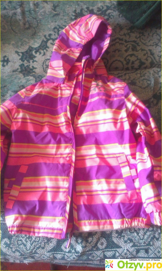 Сам капюшон на кнопках, его можно отстигнуть, он не глубокий, никак не регулируется. Имеются два маленьких кармашка на липучках. Полоски придают дополнительную задорность курточке.