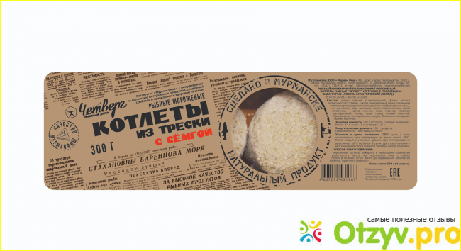Упаковка выполнена в винтажном стиле с намеком на советское прошлое. В пластиковом контейнере всего четыре котлетки. 300 гр. стОят чуть больше 100 рублей. Относительно не дорого. И самое главное - вкус. Котлеты ароматные. Больше, конечно, трески. Семги я не заметила во вкусе. Но мне это не помешало оценить гастрономический аспект.