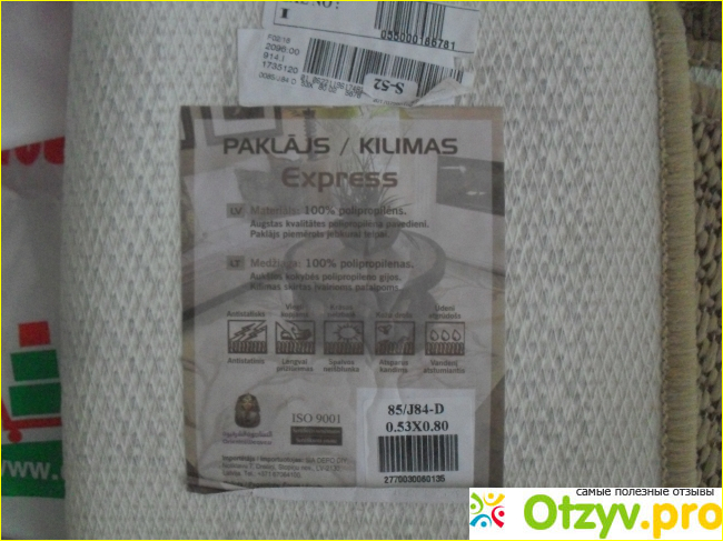 Символами обозначены его свойства. Не все понятны, только первый могу расшифровать. Антистатическая пропитка имеется. А далее об уходе. Но, у меня же это изделие не будет на полу лежать Вот так это выглядит.
