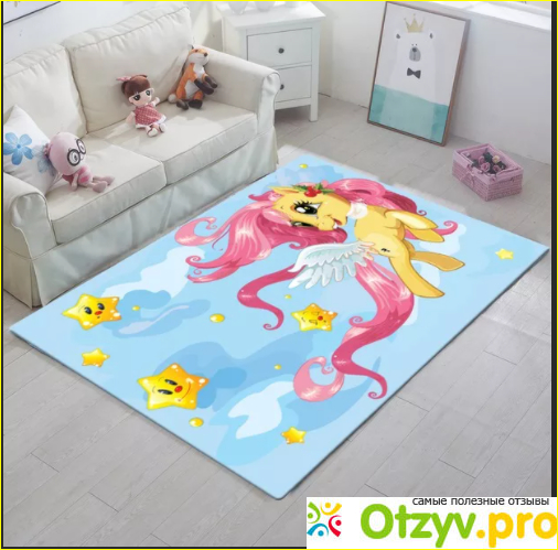 Верхнее покрытие — это материал под названием велюр: мягкий, приятный, который хочется бесконечно гладить. Такую материю любят все, тем более, когда это коврик. И на него ребенку (да и взрослому, чего уж скрывать) захочется наступать бесконечно. А учитывая, что детские ножки достаточно чувствительны к мягкости — малыши просто в восторге от этого милого поняшки.