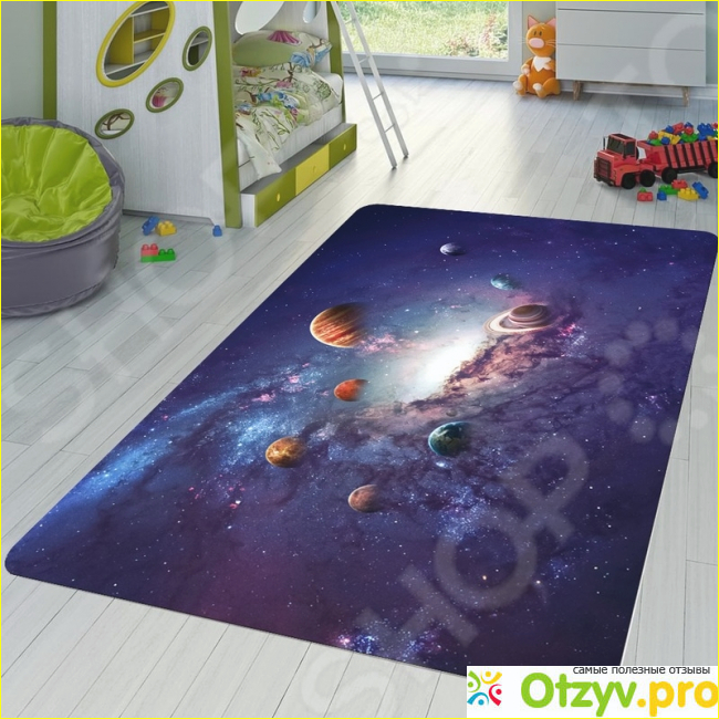 Искали мы подходящий ковер долго, но увидели в интернете очень интересный коврик и сразу на нем остановились, да и ребенку он очень понравился. Когда наша покупка приехала, мы не пожалели. Так как изделие очень легкое, удобное и мягкое на ощупь. Для детской комнаты это идеальное решение, так как на нем можно играть, просто полежать или сидеть на нем. Так как дети на полу проводят значительную часть дня, даже могут сидеть и смотреть мультфильмы. Фотопечать на ковре просто замечательная, он подойдет абсолютно для любого интерьера. На нем действительно интересно сидеть и играть. Изображены на изделии планеты в космосе.