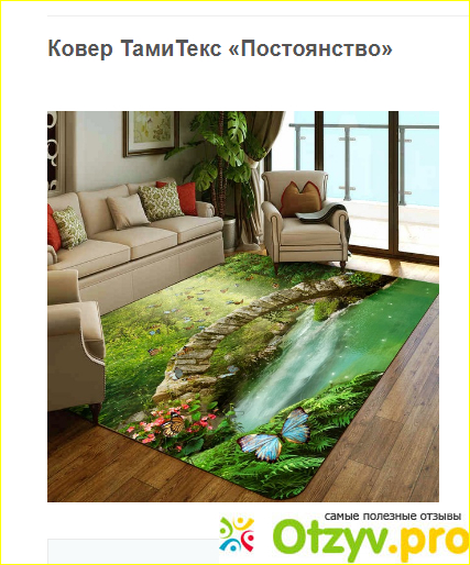 Я удивилась обилию предложений недорогих ковров, по низким ценам, да еще и хорошего качества. Коврик плотный, крепенький, материя такая, которая не боится различных испытаний, сразу видно, что вещь произведена в России.