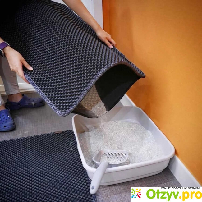 Мне нравится использовать коврик, когда он закрыт с одной стороны. В таком положении ничего не высыпается и происходит действительно сбор всего что выпало из лоточка. Единственный минус, который выявился в процессе эксплуатации довольно странный. Младшему коту не приятно наступать на коврик, он трясет лапками, нервируется и старается перепрыгнуть, сделать быстрые шаги, чтобы по минимуму контактировать с фактурой этой подложки.
