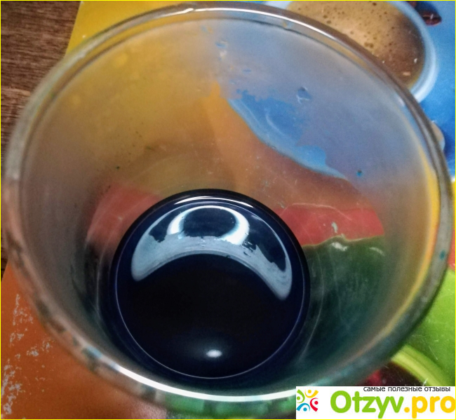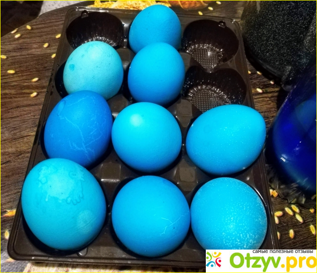 Краситель оказался не очень удобным в использовании, так как пачкал пальцы и отмывался не сразу. Я опустила яйца по одному в готовый раствор и держала их в нем 5 минут, как написано на упаковке. Однако, результат не был таким, как я ожидала. Яйца получились голубого цвета, прозрачные и ненасыщенные. Получилось не плотное окрашивание, которое подтекало.