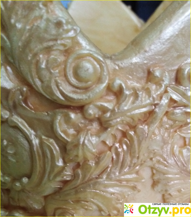 Я сформировала корону и украсила разными резными деталями. У меня есть только пищевой краситель золото российской марки Топ Декор. Называется смесь "Золотая". Но, как мне кажется, не очень оправдывает своё название. Тюбик сам большой-вес красителя 100 грамм. В этом плане он очень экономный, можно использовать довольно долго. Но в то же время очень бестолковый. Чтобы получить хоть какой-нибудь необходимый цвет, нужно покрасить изделие в несколько слоёв. И всё равно цвет будет не тот, который написан на упаковке. Вмешивать его в мастику не пробовала. Мне кажется, что этот краситель не придаст никакого нужного цвета изделию, только потратишь время и краситель.