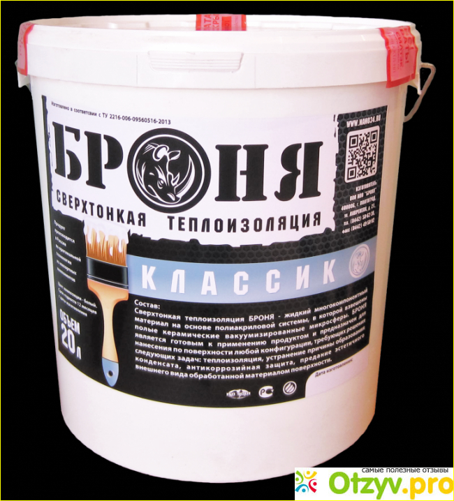 Но главное преимущество краски броня заключается в ее теплоизоляционных свойствах. Она содержит микрогранулы, между которыми находится воздух, что обеспечивает превосходный теплосберегающий эффект. Кроме того, краска содержит фиксатор, который предотвращает ее рассыпание.