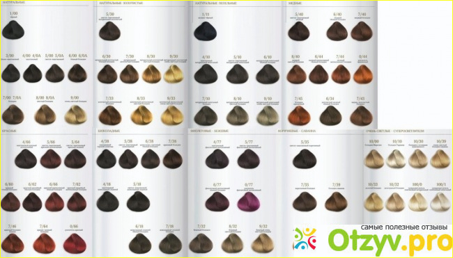Профессиональная палитра краски, в ассортимент которой входят как базовые черные, каштановые, так и множество русых, пепельных, блонд. Радует то, что присутствуют еще и полутона, что позволяет окрасить волосы в более естественный вариант.