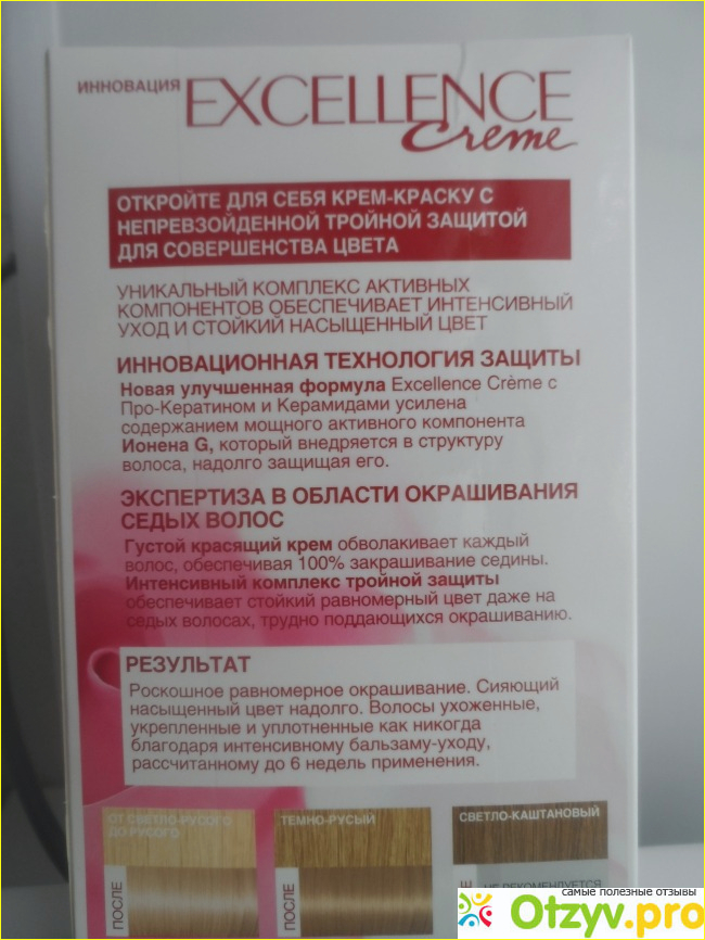 И вот где то лет пять назад, попробовала стойкую крем краску ЭКСЕЛЛАНС от Лореаль, удачно, с первого раза подобрала подходящий оттенок, люблю только тёплые блонды.