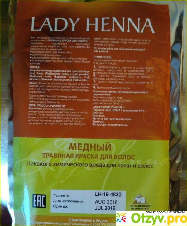 Не так давно, я использовала краску Prem Henna Nisha которая шла с авокадо и маслом, и я очень осталась довольна данной краской, однако цвет опять мне не подошёл. Последнюю краску которая взяла это было Lady Henna в медном цвете. Мой исходный цвет волос был рыжим, а я не думаю, что если чем-то переборщить, то это будет сильно заметно. Расчет строился на том, что мой коричневый цвет который был до этого станет немного радостей, и посветлеет. Сама краска упакована в очень достойную яркую солнечную упаковку. Посередине упаковки изображена прядь медно рыжих волос, которая как бы показывает, какой цвет волос у вас должен получиться после окрашивания. Делают эту краску в Индии, и она проходит тесты на животных. Срок хранения небольшой и немаленький и составляет около 3 лет. Стоит сейчас эта краска дёшево, во всяком случае мне так показалось. Однако еще полгода назад она стоила на 100 руб. дешевле. Тут ничего не поделаешь, всё дорожает, это является закономерной тенденцией, которая не имеет конца.