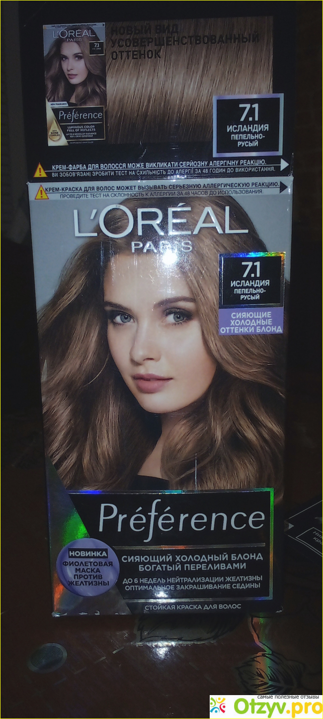 Всем привет! Наконец решила привести волосы в порядок, начала с покупки краски для волос. Так как мои волосы всегда отдают в рыжину, я отдаю предпочтение краскам с пепельным оттенком и беру всегда аммиачные. В этот раз я выбрала L'Oréal Paris 7.1 Исландия пепельно русый.