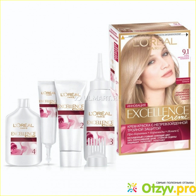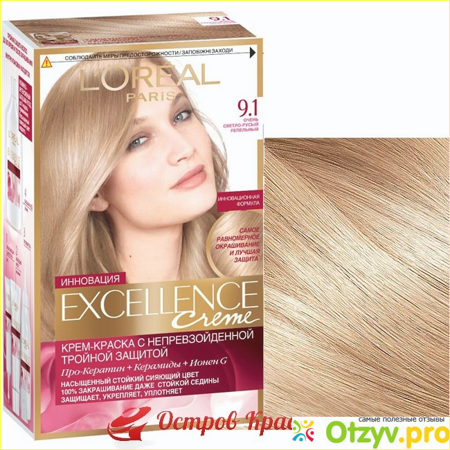 Виски у меня очень плохо закрашиваются и в поисках добротного красителя остановилась на краске для волос L'Oreal Paris Excellence 9.1 "Очень светло-русый пепельный" - последнее время красилась лондоколором (не плохо справляется с сединой), но на момент покупки таковой не оказалось.