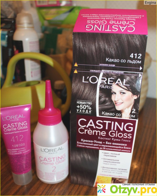 Хочу рассказать про оттенок номер 412, называется интересно "Какао со льдом", звучит с холодком и говорит о том, что и цвет будет с холодом. Производитель обещает именно холодный каштановый, вот и мы с подругой решили покрасить ей волосы в этот интересный цвет.
