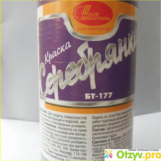 Санкт-Петербург. Она не слишком токсична, полностью высыхает за 4 часа, но самое главное ее достоинство - это то, что она долго не теряет своих свойств. Производитель заявляет, что срок годности - 12 месяцев, но на самом деле он намного больше. Я несколько лет назад купила бутылочку Краски Серебрянки БТ-177, ежегодный расход ее у меня небольшой, время идет, а потребительские качества ее не теряются. Достаточно перед употреблением встряхнуть содержимое такой бутылки, вылить в небольшую тару некоторое количество краски и "посеребрить" какое-то металлическое изделие. Укрывистость тоже не снижается.