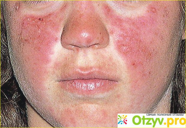 кожная сыпь. Типичным является покраснение кожи на лице, напоминающее бабочку, которое