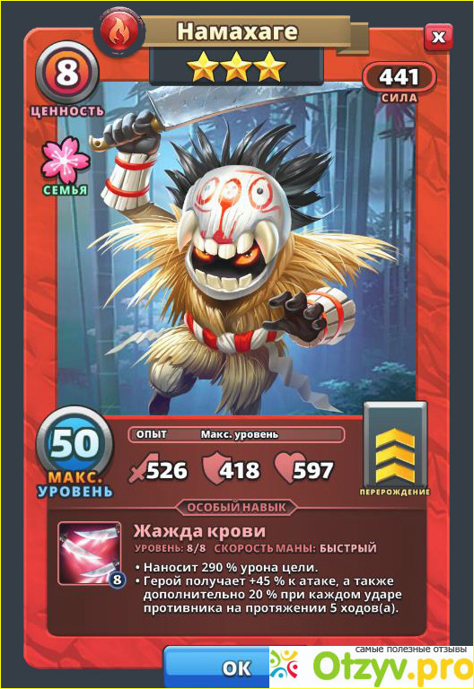 Я обрадовалась, когда пополнила свою коллекцию аттакеров соломенным демоном. Герой красного цвета, Намахаге, относится к классу варвар. У него только три звезды, поэтому на поздних уровнях против четыре- или пятизвёздочных героев слабоват.