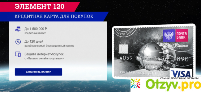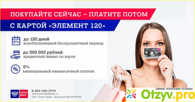 Пользуюсь продуктами банка несколько лет, поэтому получила персональное предложение на кредит на льготных условиях. Без этих денег можно было бы обойтись, но предложение показалось заманчивым и я решила осуществить одну свою давнюю мечту (покупка). Не долго думая приобрела кредитную карту "Элемент 120".