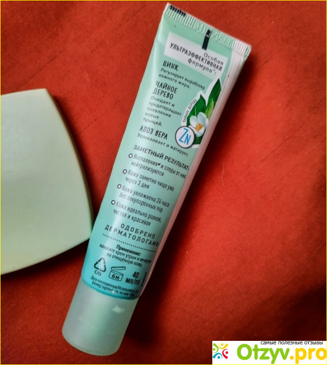 Продукт содержит в составе масло эфирное чайного дерева, а также цинк. Текстура у него лёгкая, он очень быстро впитывается и не оставляет никакой жирной плёнки или её ощущения на лице. А что очень понравилось - так это то, что крем матирует кожу. Не на целый день. Но всё равно для меня даже если на пару часов - это уже результат.