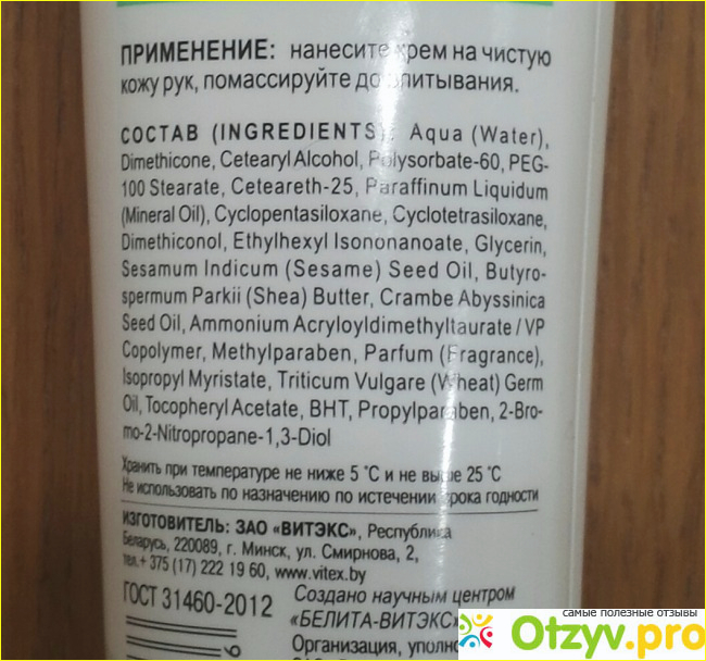 В составе крема заявлено масло кунжута, которое оказывает регенерирующее действие, устраняет сухость и шелушения. Так же здесь есть пчелиный воск и глицерин, которые увлажняют и смягчают кожу.