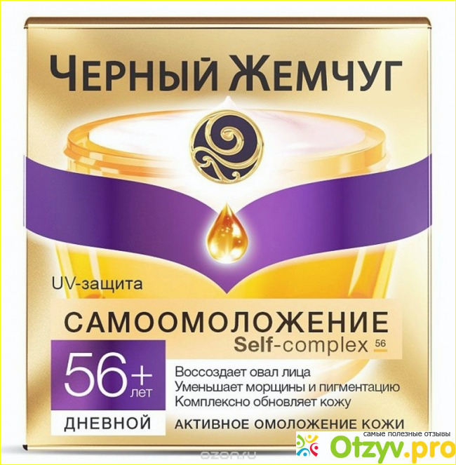 Дневной же крем из серии Самоомоложение 56 + Черный жемчуг рассчитан и разработан специально для зрелой кожи лица. Сам крем продается в очень красивой коробочке сиренево-золотистого цвета. Вообще вся линия средств которая рассчитана на этот возраст имеет приблизительно одинаковое оформление по цвету.