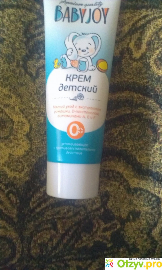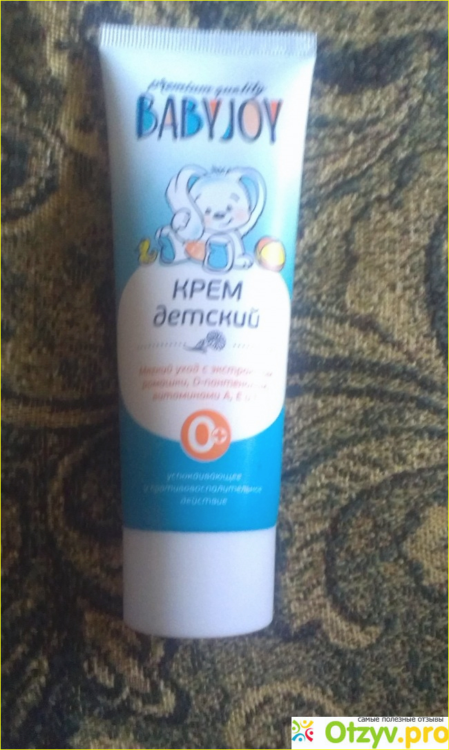 Состав детского крема " Baby Joy" достаточно хороший: имеются полезные компоненты: витамины: А, Е,F, экстракт ромашки, D- пантенол. Действие крема направлено на успокоение кожи и снятие различных воспалений и устранения различных опрелостей и покраснений. Устраняет раздражение.