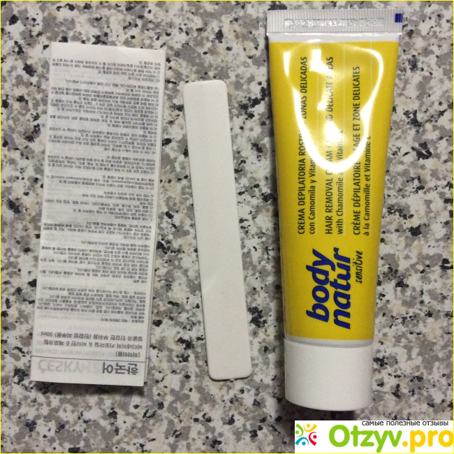 Внутри коробочки расположился тупик с кремом для депиляции, палочка для удобства нанесения и снятия средства с кожи и подробная инструкция по применению.